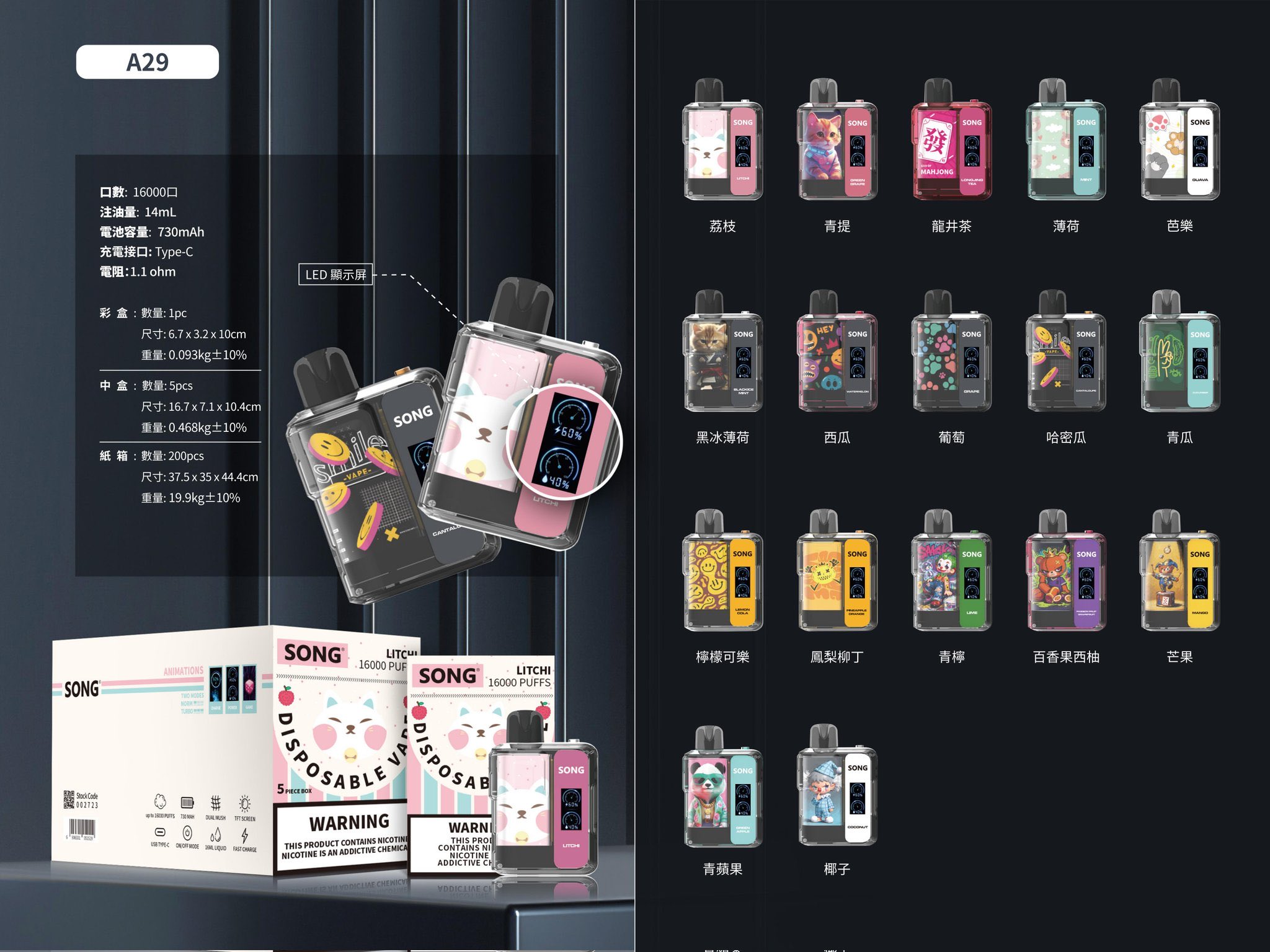 崧A29属于高容量一次性电子烟,官方标称16000口,定位偏向重度用户或者不想频繁更换设备的人群。和传统小体量一次性产品不同,A29在功能层面更接近“可玩型一次性”。